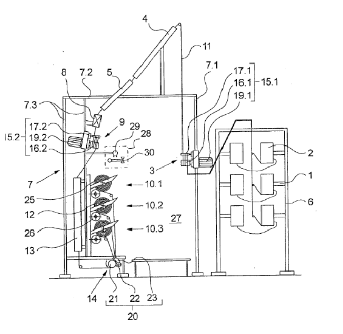 1. Machine de texturation par faux-tour pour déformer plusieurs fils multifilaires (…), caractérisée en ce que le premier mécanisme de transport (3) et le deuxième mécanisme de transport (9) sont chacun constitués d’un mécanisme de transport par enroulement (15.1, 15.2), tandis que le troisième mécanisme de transport (14) est constitué d’un mécanisme de transport par serrage (20).